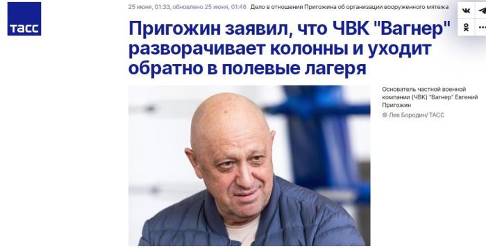 另?yè)?jù)俄新社稍早前報(bào)道,24日,白俄羅斯總統(tǒng)盧卡申科與普里戈任進(jìn)行了交流,普里戈任接受了盧卡申科關(guān)于停止“瓦格納”在俄行動(dòng),以及采取措施緩和緊張局勢(shì)的建議。