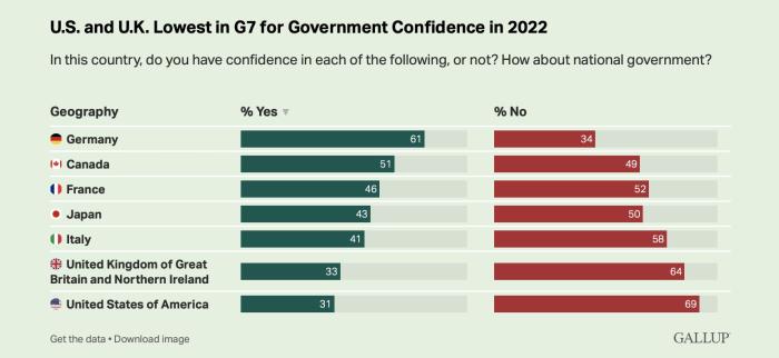 蓋洛普民調(diào):七國(guó)集團(tuán)中美英兩國(guó)政府信心指數(shù)最低