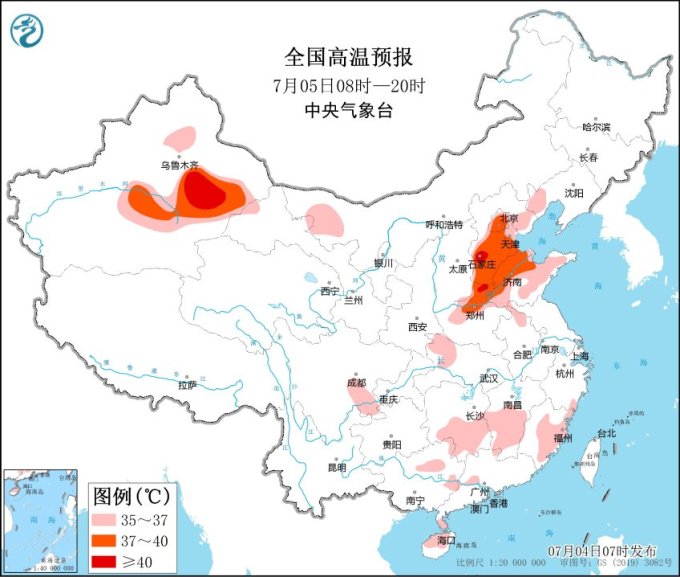 高溫方面,受降雨影響華北大部高溫天氣得到短暫緩解,明天起(5日)京津冀及黃淮等地高溫將再度發(fā)展加強(qiáng),河北大部、北京、天津、山東北部、河南中北部等地日最高氣溫可達(dá)37~39℃,部分地區(qū)超過40℃。請公眾注意做好防曬降溫措施,盡量減少外出和戶外活動時(shí)間,及時(shí)補(bǔ)充水分,警惕高溫引發(fā)的中暑。