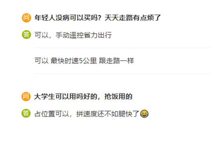 中新財(cái)經(jīng)注意到,在電商平臺(tái)上電動(dòng)輪椅的問答區(qū),不少消費(fèi)者都對(duì)電動(dòng)輪椅展現(xiàn)出了濃厚的興趣,“年輕人沒病可以買嗎?天天走路有點(diǎn)煩了?!薄按髮W(xué)生可以用嗎?”“食堂搶飯用!神器?!薄澳贻p人也可以用,省力出行。”