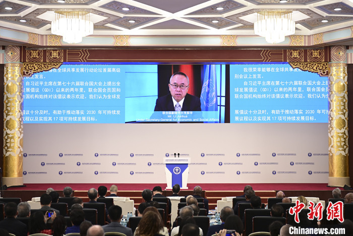 7月10日,全球共享發(fā)展行動論壇首屆高級別會議在北京開幕。聯(lián)合國副秘書長李軍華在開幕式作視頻致辭時指出,實施2030年可持續(xù)發(fā)展議程的時間框架已過半,但只有約12%的可持續(xù)發(fā)展目標有望在2030年之前實現(xiàn),聯(lián)合國呼吁各會員國加大投入,為有需要的國家增加可負擔的長期發(fā)展融資。 中新社記者 田雨昊 攝