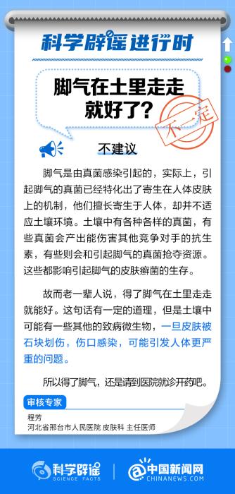 老一輩人說,得了腳氣在土里走走就能好。這句話有一定的道理,但是土壤中可能有一些其他的致病微生物,一旦皮膚被石塊劃傷,傷口感染,可能引發(fā)人體更嚴(yán)重的問題。所以得了腳氣,還是請到醫(yī)院就診開藥吧。(來源:科學(xué)辟謠、中國新聞網(wǎng)微博)