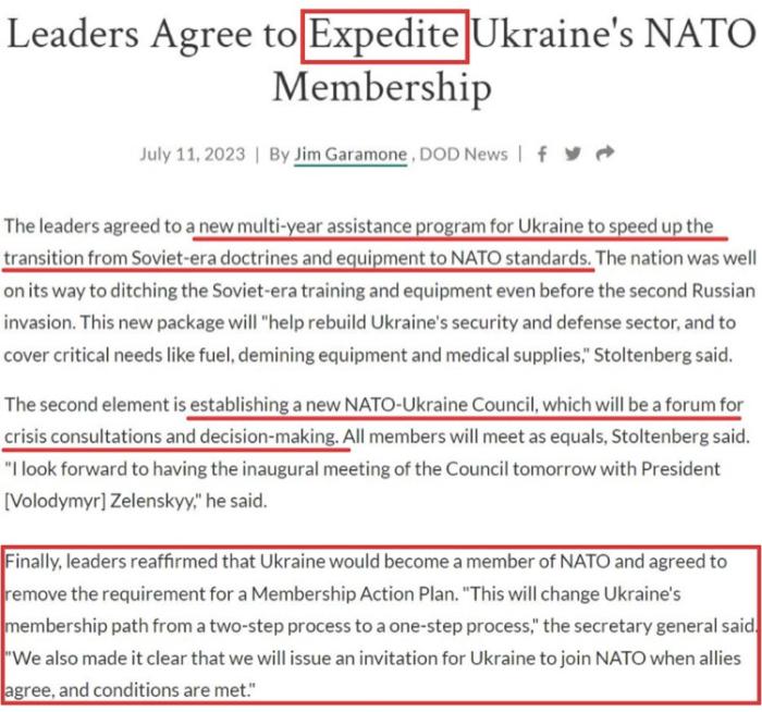 在一片爭(zhēng)吵聲中,北約立陶宛峰會(huì)發(fā)表的公報(bào)確定了一個(gè)包含“三要素”的“加快烏克蘭入約計(jì)劃”: