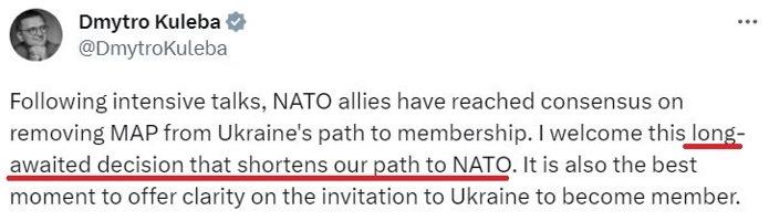 烏克蘭外長(zhǎng)庫(kù)列巴說(shuō),這將“縮短烏克蘭加入北約的進(jìn)程”,是烏方“期待已久的決定”。
