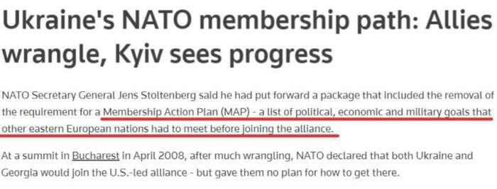 在美國(guó)推動(dòng)下,那次北約峰會(huì)接受了烏克蘭加入北約“成員國(guó)行動(dòng)計(jì)劃”的申請(qǐng),并首次承諾“最終會(huì)接納烏克蘭為北約成員國(guó)”。