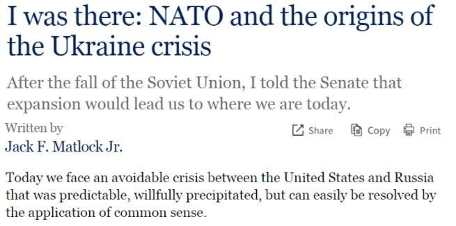 △美國(guó)昆西負(fù)責(zé)任治國(guó)研究所網(wǎng)站:美國(guó)最后一任駐蘇聯(lián)大使馬特洛克曾撰文感嘆,“我們今天正面臨一場(chǎng)原可避免的危機(jī)。這是一場(chǎng)可被預(yù)測(cè)、也的確曾被預(yù)測(cè)、卻又被蓄意促成的危機(jī)”。