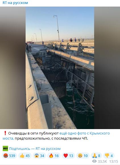 俄媒“今日俄羅斯”(RT)發(fā)布了據(jù)稱是目擊者在克里米亞大橋事件后拍攝的大橋圖片。圖片來(lái)源:RT社交媒體截圖