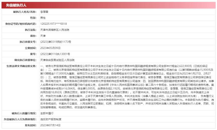 中國(guó)執(zhí)行信息公開(kāi)網(wǎng)顯示,目前恒信璽利存在多條被執(zhí)行人信息,恒信璽利和李厚霖也多次收到限制消費(fèi)令。