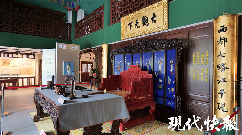 館內(nèi)鴛鴦廳為“何以狀元”主題展廳,通過實物展品再現(xiàn)古代科舉流程,介紹了一個狀元是如何誕生的。現(xiàn)代快報記者了解到,2001年,在整修鴛鴦廳時,曾在上方發(fā)現(xiàn)一方被后人所加“吊頂”遮住的匾。潘世恩高中狀元后,為官五十余年,歷經(jīng)四朝,深得皇帝恩寵,被譽為“三百年間第一福氣之人”。每逢大壽,皇帝都會親賜御匾。后經(jīng)專家考證,該匾即是道光皇帝于潘世恩六十大壽之時御筆賞賜的黑底盤龍金書方匾。