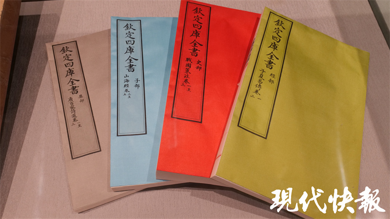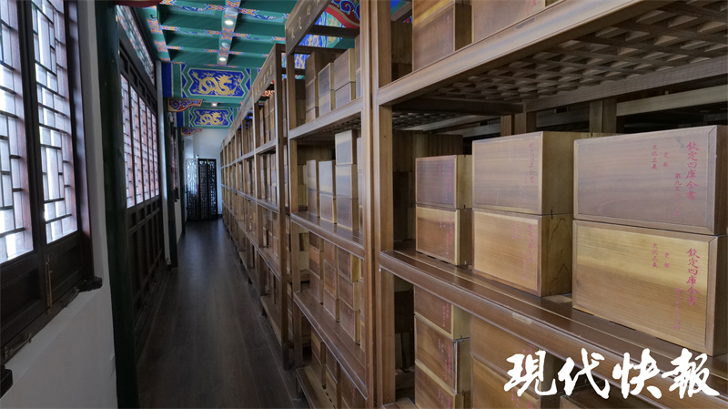 文匯閣二樓、三樓收藏了一部《四庫全書》,據(jù)了解,這部《四庫全書》是2013年由商務(wù)印書館榮譽出版、揚州國書文化公司策劃制作的原樣、原大、原色《四庫全書》復(fù)制本。它與原書大小、顏色、紙質(zhì)、裝幀相同,封面仍是絹帛五色:經(jīng)部綠色、史部紅色、子部月白色、集部灰黑色、總目黃色。書籍與書函、書架配套,共計木函6144個、書架128個。《四庫全書》的裝潢非??季浚坎繒加脙善酒瑠A住,束以綢帶,再放入楠木盒中。盒蓋上刻有書籍的書名和所屬部類順序等信息,以便查閱。現(xiàn)在,游客經(jīng)過預(yù)約就可以可到二樓參觀《四庫全書》部分藏書,親身感受這套浩瀚巨制。