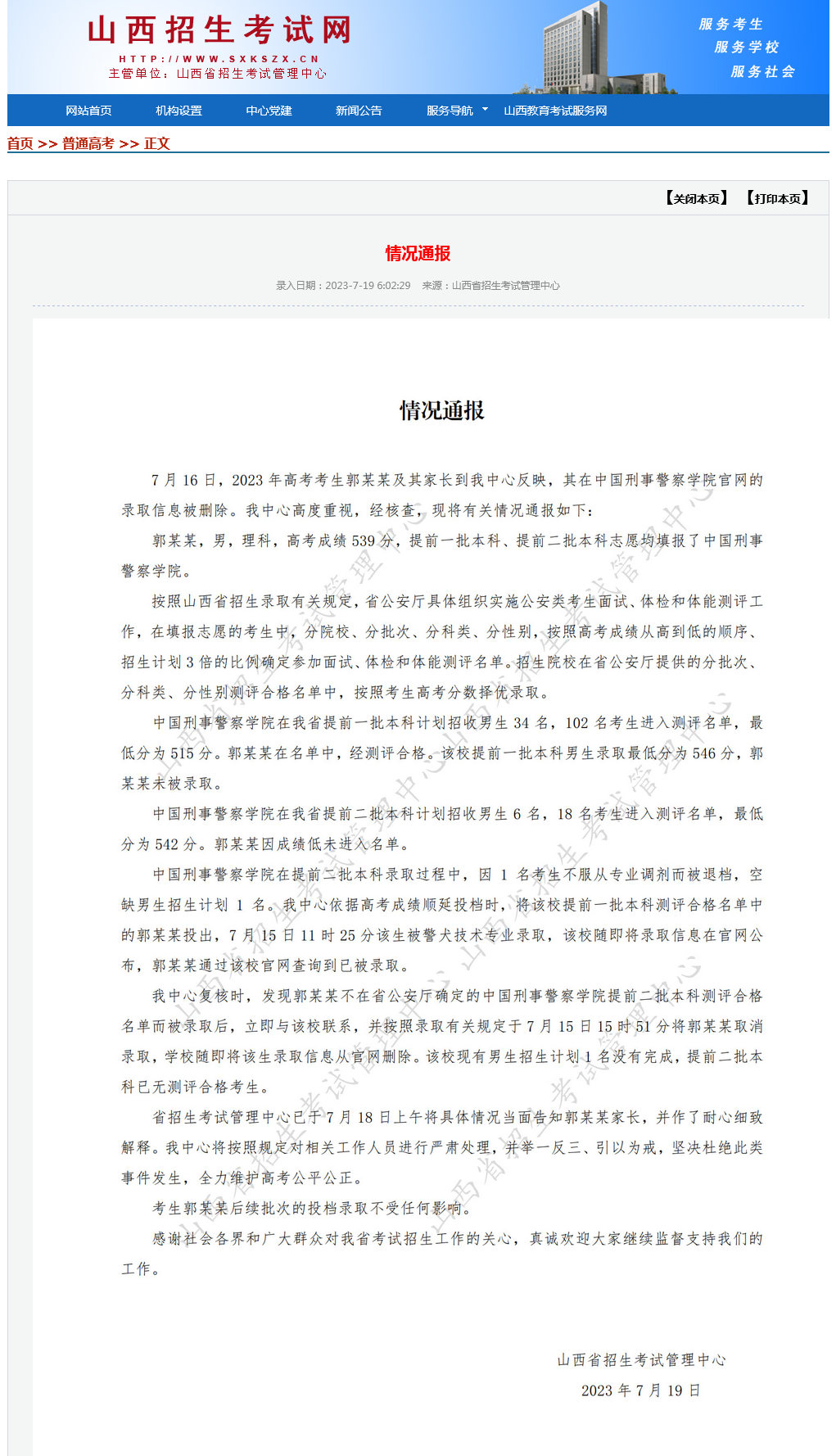 中新網(wǎng)7月19日電 據(jù)山西招生考試網(wǎng)消息,山西省招生考試管理中心19日發(fā)布情況通報稱,7月16日,2023年高考考生郭某某及其家長到該中心反映,其在中國刑事警察學院官網(wǎng)的錄取信息被刪除。該中心高度重視,經(jīng)核查,有關情況如下: