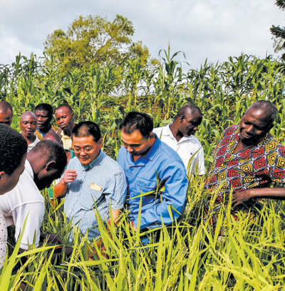 中國中化控股有限責任公司旗下荃銀高科的水稻專家在多哥示范田現(xiàn)場,為當?shù)剞r(nóng)民講解水稻抽穗揚花期的關(guān)鍵技術(shù)和田間管理要點。