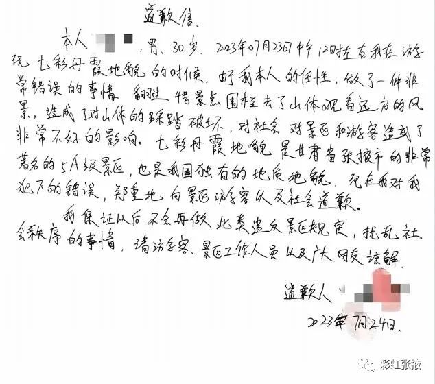 通報(bào)表示,該游客進(jìn)入?yún)^(qū)域是張掖世界地質(zhì)公園彩色丘陵保護(hù)范圍,雖然因其行走的山脊被黃土覆蓋,未造成實(shí)質(zhì)性損害,但其行為違反了《張掖七彩丹霞保護(hù)條例》和《治安管理處罰法》相關(guān)規(guī)定。7月24日16:50該游客從旅游途中返回臨澤縣,接受相關(guān)部門(mén)調(diào)查處理。市、縣林草部門(mén)對(duì)該游客進(jìn)行了嚴(yán)肅的批評(píng)教育;丹霞景區(qū)派出所依據(jù)《治安管理處罰法》對(duì)該游客處以200元罰款;該游客深刻認(rèn)識(shí)到自身行為的錯(cuò)誤性和嚴(yán)重性,并公開(kāi)致歉。