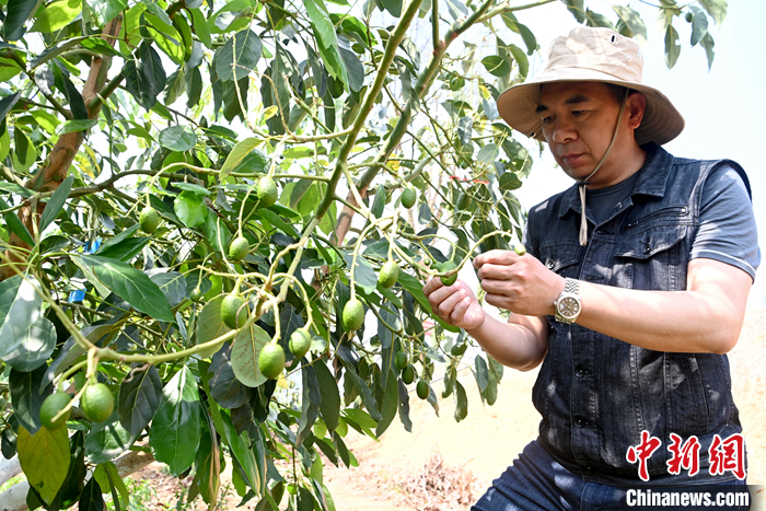 圖為4月27日,汪志哲檢查牛油果長(zhǎng)勢(shì)。 中新社記者 李嘉嫻 攝