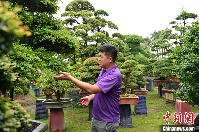 圖為7月18日,廣東佛山,王俞又在嘉盛園藝總場介紹盆景養(yǎng)護(hù)技巧。 中新社記者 陳楚紅 攝