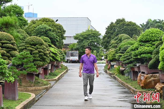 在廣東省佛山市青年臺商會會長王俞又的帶領(lǐng)下,中新社記者近日走進(jìn)位于佛山順德陳村花卉世界的嘉盛園藝總場。園藝場內(nèi),只見大小不一、神韻各異的盆景擺放錯落有致,讓人宛若置身“世外桃源”。