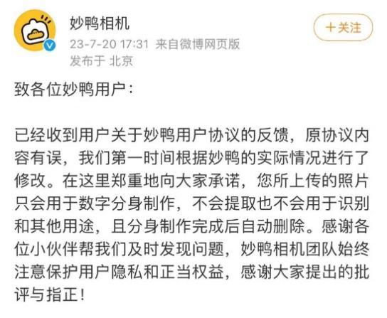 對(duì)此,妙鴨相機(jī)在7月20日回應(yīng)稱,原協(xié)議內(nèi)容有誤,并第一時(shí)間刪除了相關(guān)條款。