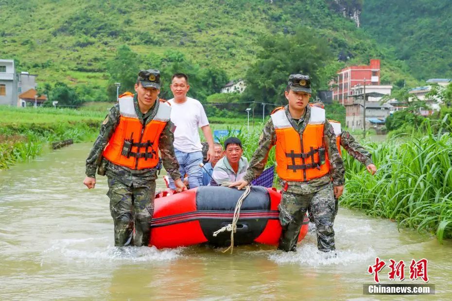 2023年6月24日,廣西河池市都安縣拉烈鎮(zhèn)三表村臨近河床水位上漲河水倒灌、山洪暴發(fā),部分村民被洪水圍困。武警官兵利用橡皮艇轉(zhuǎn)移受災(zāi)民眾。