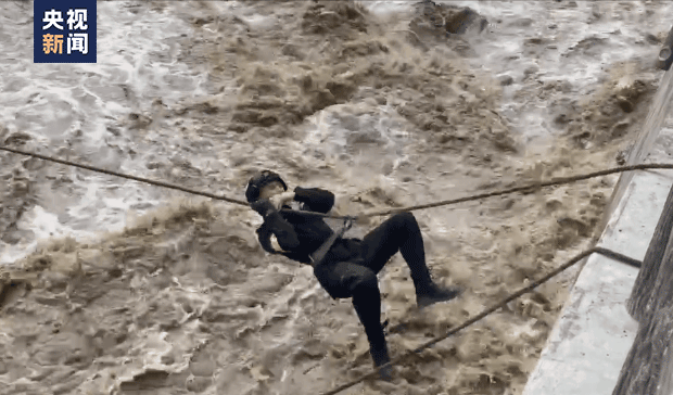 2022年9月5日,四川甘孜州瀘定縣發(fā)生6.8級地震,磨西鎮(zhèn)與青崗坪交匯處,湍急的流水?dāng)r住去路。甘孜特警隊員們用身體和繩索搭建橋梁,徒手爬繩索前往對岸救援。圖片來源:央視新聞視頻截圖