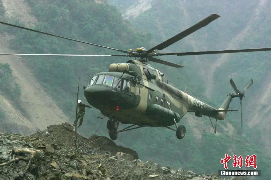 2008年5月20日,成都軍區(qū)陸航團姜廣偉王牌直升機組上午十時以單輪首次成功強降北川重災(zāi)區(qū)“定時炸彈”——堰塞湖無名塌方小土堆上。中新社記者 賈國榮 攝