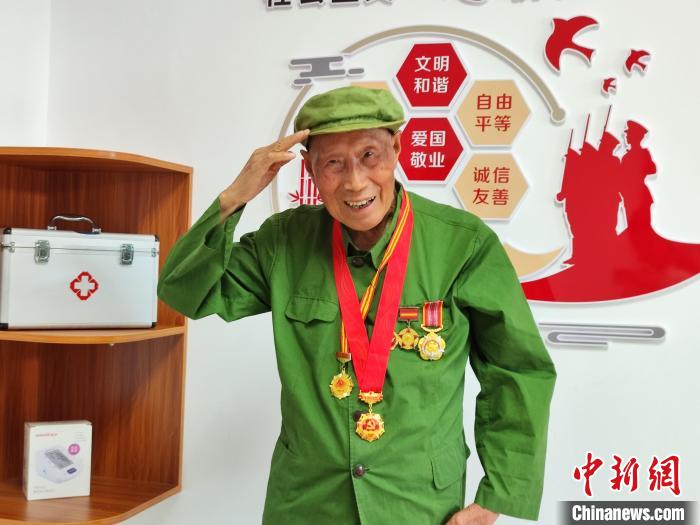 中新網(wǎng)贛州8月1日電 (熊錦陽)整理好軍裝,佩戴上勛章,8月1日清晨,老兵王益民就已洗漱完畢,對他而言,今天是一個重要的日子。早上6點15分,通過直播,王益民聚精會神地觀看著南昌八一廣場上舉行的升旗儀式,隨著五星紅旗緩緩升起,這位93歲的抗美援朝老兵迅速立正抬手,向著鮮艷的國旗做了一個標(biāo)準(zhǔn)的軍禮……