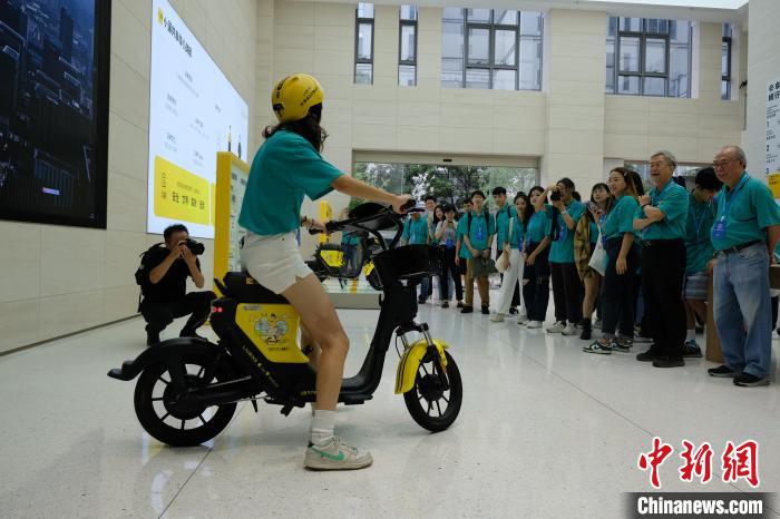 臺生體驗小遛共享電單車?!≈行律缬浾?林波攝