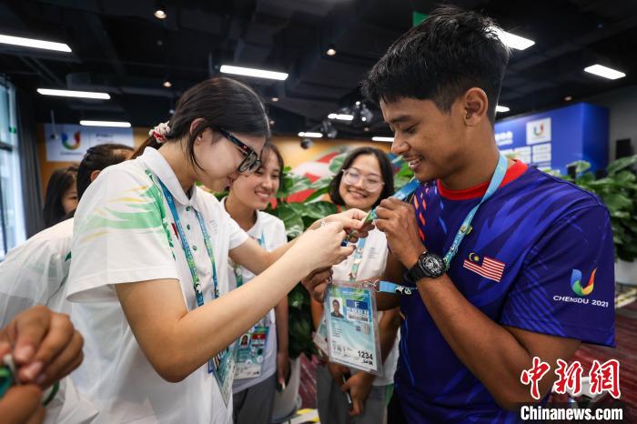 如果問起成都大運村最流行的“游戲”,幾乎每位“村民”都會毫不猶豫地脫口而出:交換徽章。不少人胸前的證件掛繩上都別滿了徽章,擁有徽章仿佛擁有財富。美國賽艇運動員WiIliam Joseph驕傲地向記者一一展示他換到的各色徽章?!拔矣?5枚!這枚來自日本賽艇隊,這枚是一種特別的中國樂器琵琶,這枚是川劇面具……”