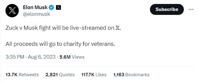 據(jù)報道,當天,馬斯克在社交媒體X發(fā)文稱,“扎克伯格與馬斯克之戰(zhàn)將在X上直播。所有收益將捐給退伍軍人慈善機構?!?/p>