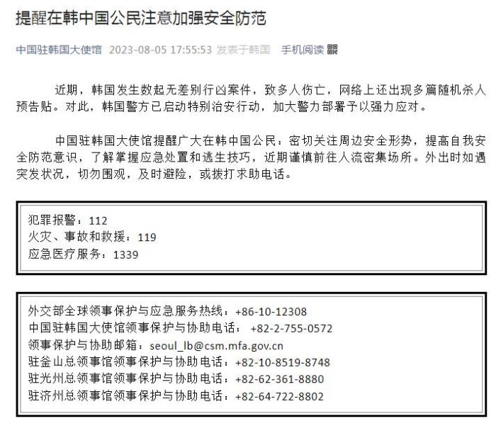 中國(guó)駐韓國(guó)大使館提醒:在韓中國(guó)公民注意加強(qiáng)安全防范
