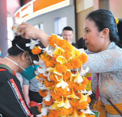 在印度尼西亞巴厘島伍拉萊國際機場,工作人員為中國游客佩戴迎賓花環(huán)。
