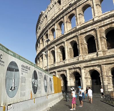在意大利羅馬熱門景點斗獸場,游客正在閱讀帶有中文解說的標識牌。