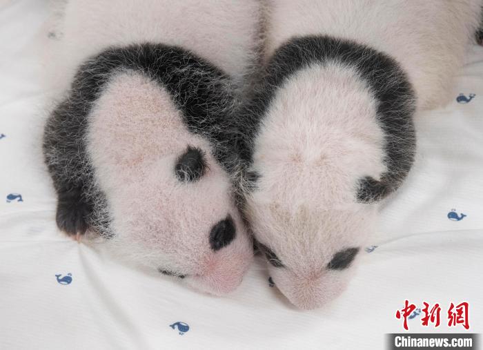 當(dāng)?shù)貢r(shí)間8月7日,韓國三星愛寶樂園公布雌性雙胞胎大熊貓幼崽(左為姐姐)于前一天拍攝的滿月照。 (愛寶樂園供圖)