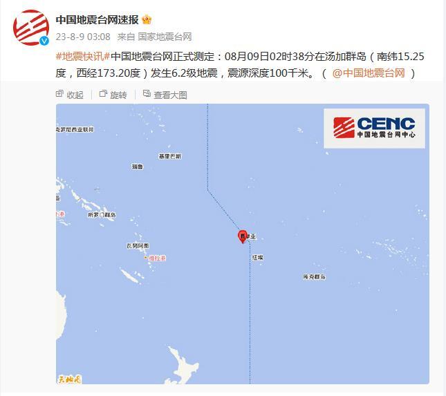 中國地震臺網(wǎng)正式測定:08月09日02時38分在湯加群島(南緯15.25度,西經(jīng)173.20度)發(fā)生6.2級地震,震源深度100千米。(國家地震臺網(wǎng)官方微博)