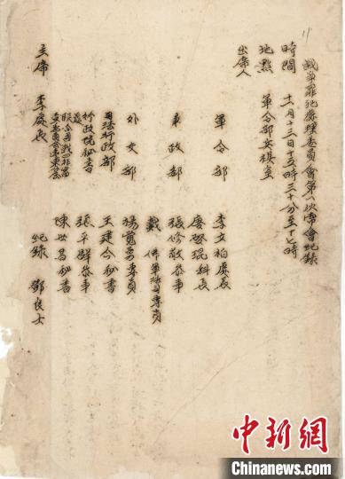 資料圖:戰(zhàn)爭罪犯處理委員會第一次常會記錄。民盟上海市委會供圖