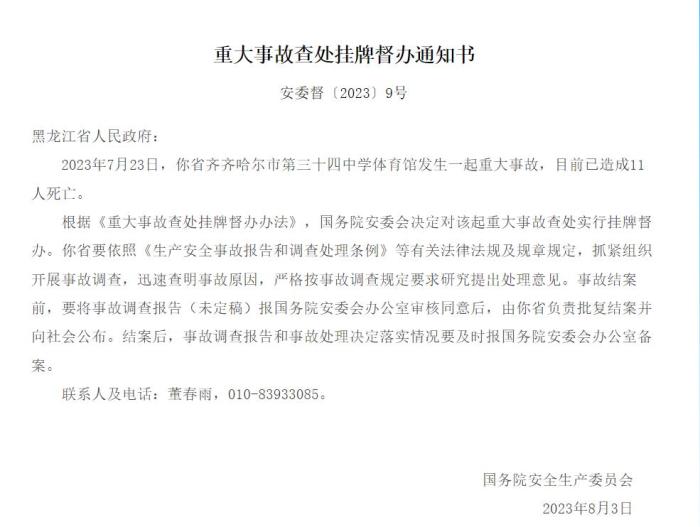 中新網(wǎng)8月14日電 據(jù)應急管理部網(wǎng)站14日消息,國務院安委會發(fā)布重大事故查處掛牌督辦通知書。2023年7月23日,黑龍江省齊齊哈爾市第三十四中學體育館發(fā)生一起重大事故,目前已造成11人死亡。根據(jù)《重大事故查處掛牌督辦辦法》,國務院安委會決定對該起重大事故查處實行掛牌督辦。