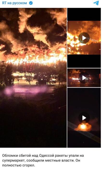“今日俄羅斯”(RT)稱,在敖德薩上空被擊落的導(dǎo)彈碎片墜落在一家超市,超市被完全燒毀。此外,一所教育機(jī)構(gòu)的宿舍樓也遭到破壞。