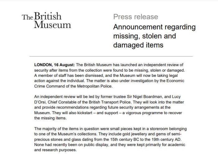 藏品丟失的具體時(shí)間沒有說明,但據(jù)大英博物館董事會(huì)董事長(zhǎng)喬治·奧斯本表示,董事會(huì)成員在“今年早些時(shí)候”得知此事,非常擔(dān)憂。