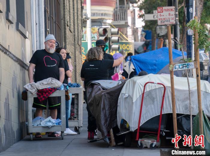 當(dāng)?shù)貢r(shí)間8月18日,慈善機(jī)構(gòu)救世軍組織的工作人員和志愿者在美國舊金山田德隆區(qū)街頭分發(fā)食物和衣服。中新社記者 劉關(guān)關(guān) 攝