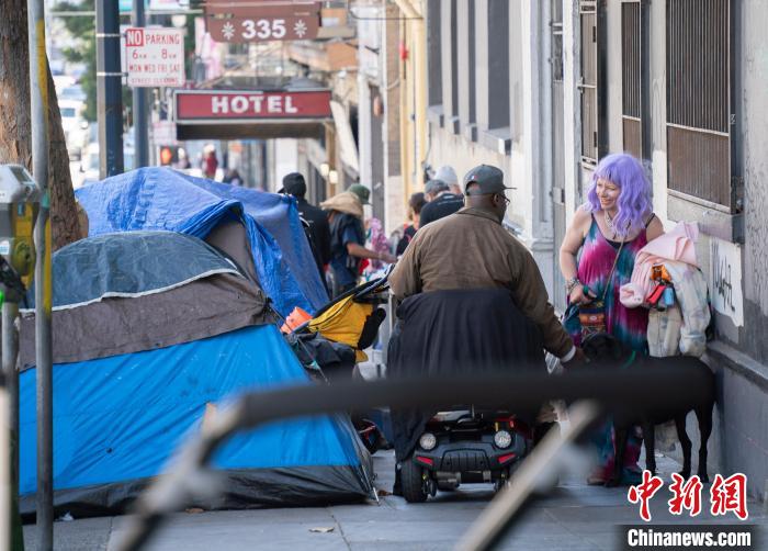 當(dāng)?shù)貢r(shí)間8月18日,無家可歸者從美國舊金山田德隆區(qū)街頭經(jīng)過。中新社記者 劉關(guān)關(guān) 攝