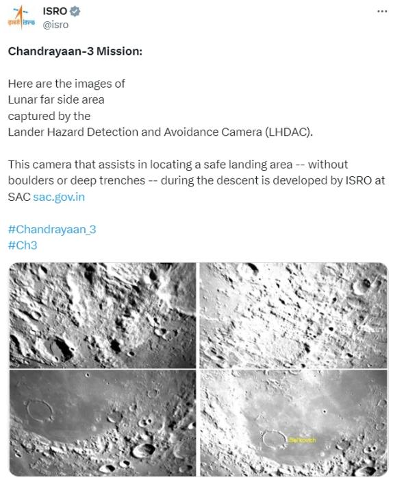 當(dāng)?shù)貢r間8月21日,ISRO在社交媒體上發(fā)布了“月船3號”上的LHDAC相機(jī)(著陸器危險探測與規(guī)避相機(jī))拍攝的月球表面圖像。圖片來源:ISRO社交賬號截圖