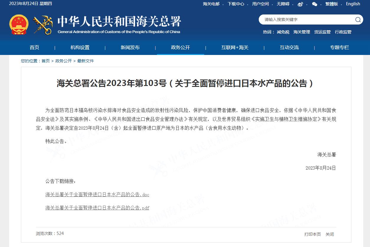 中新網(wǎng)8月24日電 據(jù)海關總署網(wǎng)站消息,為全面防范日本福島核污染水排海對食品安全造成的放射性污染風險,保護中國消費者健康,確保進口食品安全,依據(jù)《中華人民共和國食品安全法》及其實施條例、《中華人民共和國進出口食品安全管理辦法》有關規(guī)定,以及世界貿(mào)易組織《實施衛(wèi)生與植物衛(wèi)生措施協(xié)定》有關規(guī)定,海關總署決定自2023年8月24日(含)起全面暫停進口原產(chǎn)地為日本的水產(chǎn)品(含食用水生動物)。