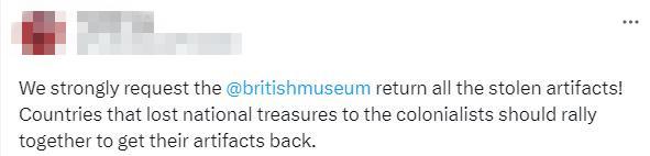 不少網(wǎng)友也在社交媒體上發(fā)文,要求大英博物館采取行動(dòng)。有人表示,“大英博物館什么時(shí)候能歸還他們從埃及、印度和伊朗偷來(lái)的東西?我可以列出更多受害國(guó)家……”