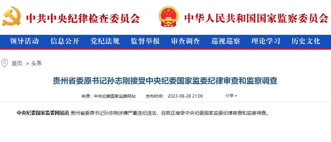 中新網(wǎng)北京8月29日電(記者 袁秀月)又見(jiàn)深夜打虎。中央紀(jì)委國(guó)家監(jiān)委網(wǎng)站28日晚通報(bào),貴州省委原書(shū)記孫志剛涉嫌嚴(yán)重違紀(jì)違法,目前正接受中央紀(jì)委國(guó)家監(jiān)委紀(jì)律審查和監(jiān)察調(diào)查。