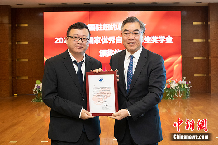 中新社紐約9月2日電 (記者 廖攀)中國駐紐約總領(lǐng)事館2日在紐約駐地舉行2022年度國家優(yōu)秀自費留學(xué)生獎學(xué)金頒獎儀式,中國駐紐約總領(lǐng)事黃屏為獲獎學(xué)生頒獎,負(fù)責(zé)教育事務(wù)的參贊余有根介紹紐約領(lǐng)區(qū)獲獎情況。獲獎學(xué)生、評審專家代表等近90人通過線上線下結(jié)合方式出席頒獎儀式。