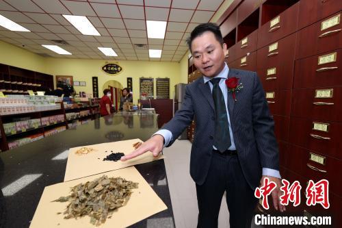 當(dāng)?shù)貢r(shí)間9月1日,加拿大多倫多,北京同仁堂位于大多倫多地區(qū)的第四家分店在安大略省列治文山(Richmond Hill)市開業(yè)。圖為北京同仁堂(多倫多)有限公司副總經(jīng)理肖常國向記者介紹店內(nèi)中藥材?!≈行律缬浾?余瑞冬 攝