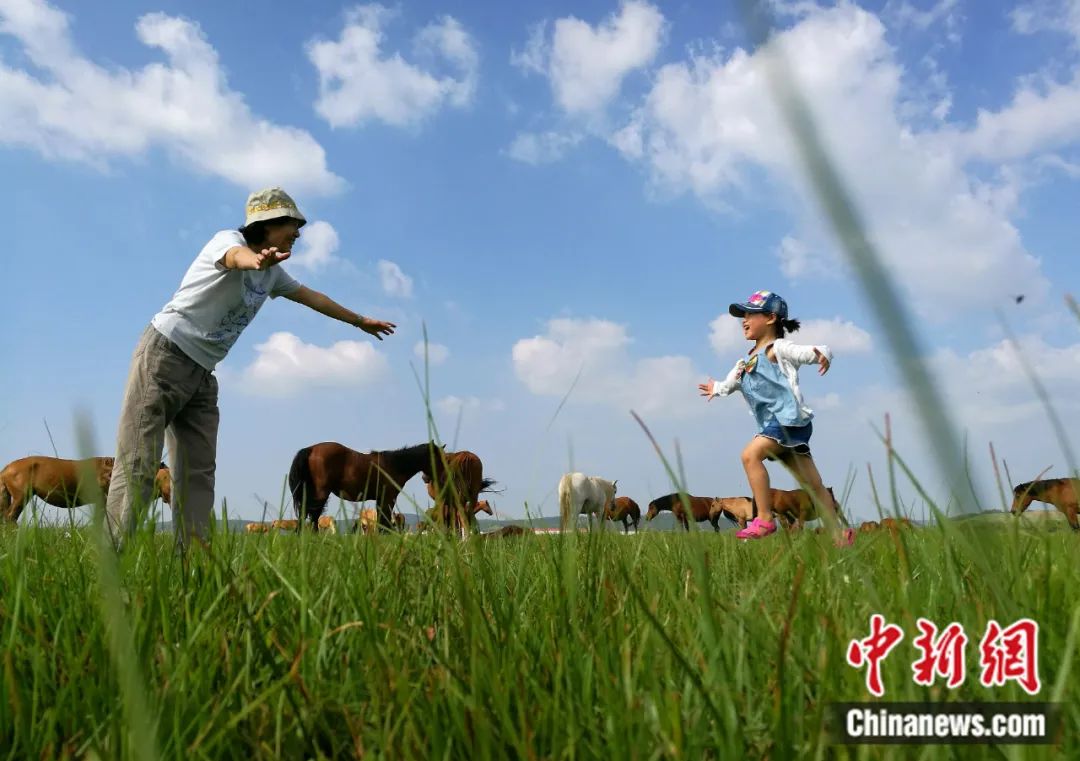 2016年8月,祖孫倆在塞罕壩機械林場內(nèi)玩耍。在半個多世紀的時間里,塞罕壩人將昔日飛鳥不棲、黃沙遮天的荒原,變成百萬畝人工林海。楊可佳 攝