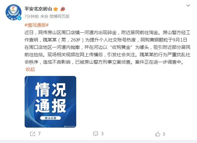 中新網(wǎng)9月3日電 3日,北京市公安局房山分局官方微博發(fā)布情況通報稱,近日,網(wǎng)傳房山區(qū)周口店鎮(zhèn)一河道內(nèi)出現(xiàn)碎金,附近居民前往淘金。房山警方經(jīng)工作查明,隗某某(男,26歲)為提升個人社交賬號熱度,網(wǎng)購黃銅顆粒于9月1日在周口店地區(qū)一河道內(nèi)拋撒,并在河邊以“收購黃金”為噱頭,吸引附近部分居民前往撿拾?,F(xiàn)場相關(guān)視頻在網(wǎng)上傳播后,引發(fā)社會關(guān)注。隗某某的行為嚴(yán)重擾亂社會秩序,造成不良影響,已被房山警方刑事立案偵查。案件正在進(jìn)一步調(diào)查中。