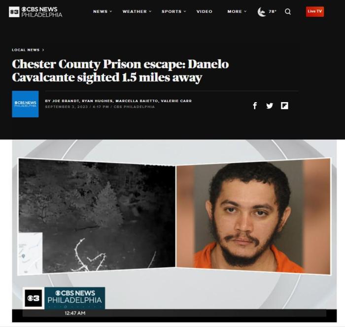 據(jù)報(bào)道,該犯人為34歲的達(dá)內(nèi)洛·卡瓦爾坎特。當(dāng)?shù)貢r(shí)間8月31日上午,他在等待被轉(zhuǎn)移至州監(jiān)獄時(shí),從賓州費(fèi)城郊區(qū)的監(jiān)獄越獄,官方尚未透露其越獄的細(xì)節(jié)。