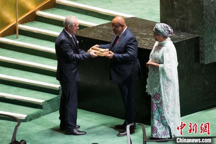 當?shù)貢r間9月5日,第77屆聯(lián)合國大會在紐約聯(lián)合國總部閉幕。在聯(lián)合國常務(wù)副秘書長阿明娜(右)的見證下,第77屆聯(lián)大主席克勒希(左一)將象征聯(lián)大主席權(quán)力的議事槌交給第78屆聯(lián)大主席弗朗西斯(中)。中新社記者 廖攀 攝