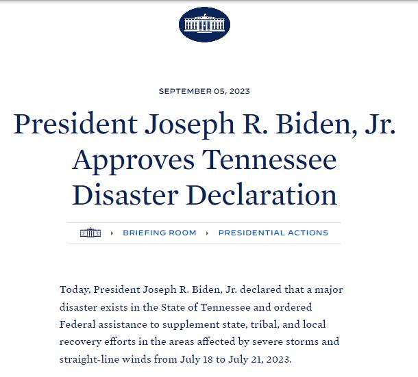 中新網9月6日電 據白宮官網消息,當?shù)貢r間9月5日,美國總統(tǒng)拜登批準田納西州重大災難聲明,并下令為田納西州從7月18日開始至7月21日期間受風暴影響的地區(qū)提供聯(lián)邦援助。
